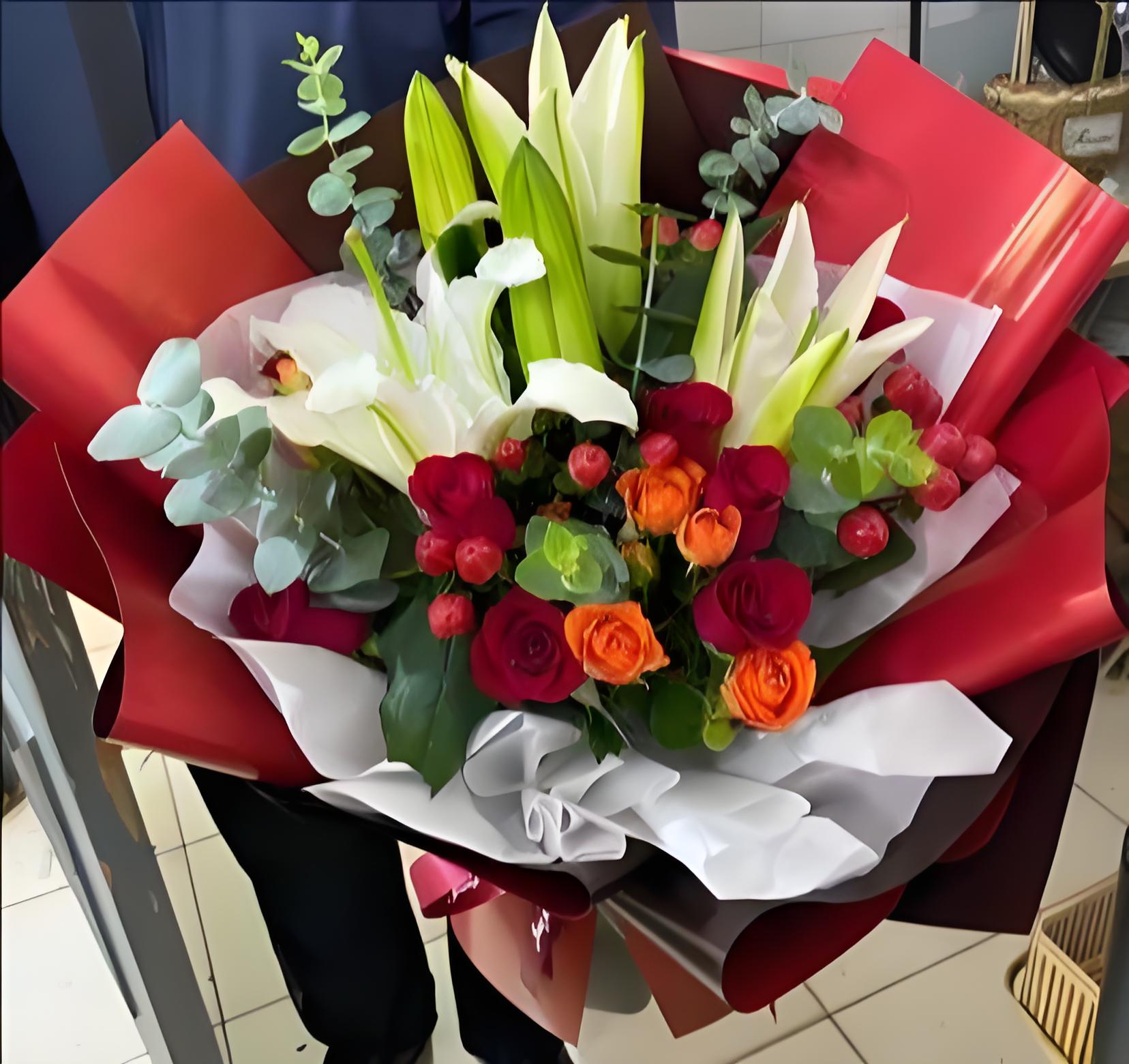绥化北林区花店包11枝红玫瑰、2枝多头白百合、6枝橙色多头玫瑰、红豆、尤加利叶